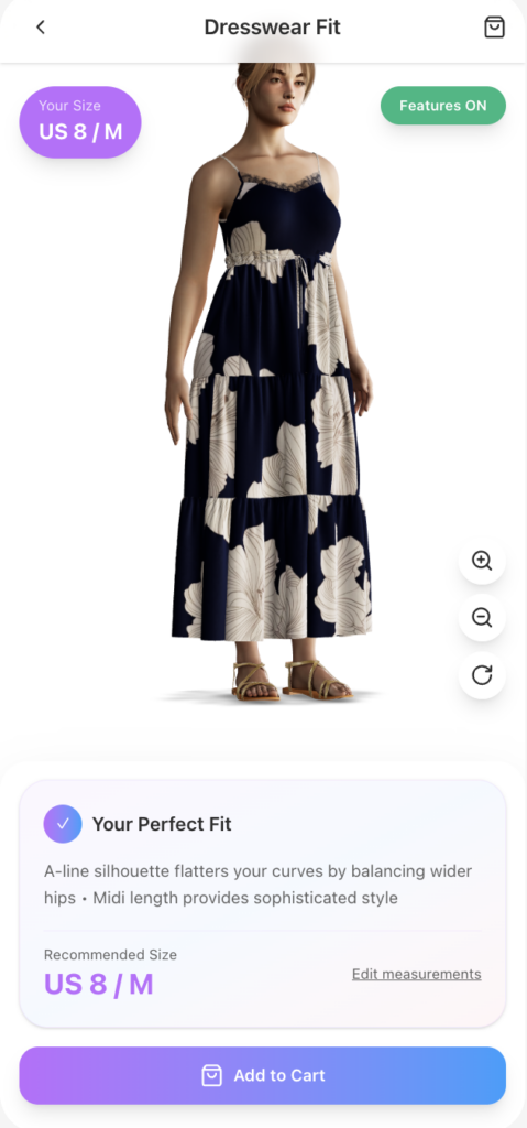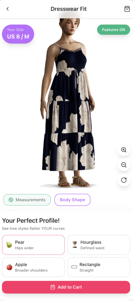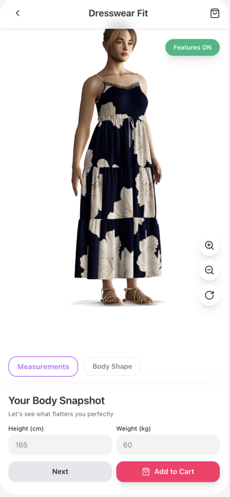 Shoppers enter a few key measurements. Dopplr creates a measurement-accurate body structure that reflects real proportions, forming the foundation for dress fit evaluation.